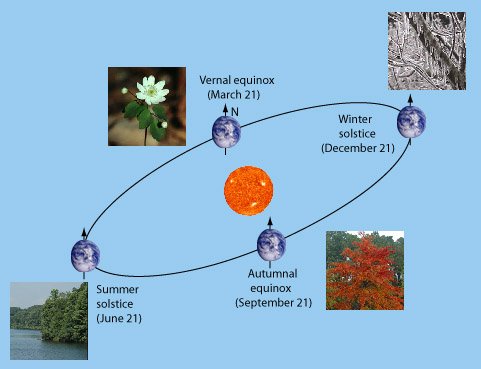 SeasonsThe seasons on the Earth arise from the fact that the Earth's spin axis is tilted 23.5° with respect to the plane of its orbit around the Sun (the ecliptic plane). The seasons indicated in the diagram below are from the perspective of the northern hemisphere. This spin axis direction is fixed in space by conservation of angular momentum with the exception of a tiny amount of precession which for this discussion has a negligible effect. Like a huge gyroscope, its axis holds its direction in space so that at the summer solstice the northern hemisphere is tilted toward the Sun and six months later is tilted away from the Sun at the winter solstice. ![]() A common misconception is that the seasons have something to do with the Earth being further from the Sun during the winter. The Earth's orbit around the Sun is very nearly circular, with only a 1.67% variation in the distance from the Sun during the year. And the time that it is slightly closer is not during the summer, but during January! This prevalent misconception about the seasons may come partly from the nature of perspective drawings like the one above which looks like an ellipse, bringing the Earth closer to the Sun at some points. But the intent of the drawing is to depict a circular orbit.