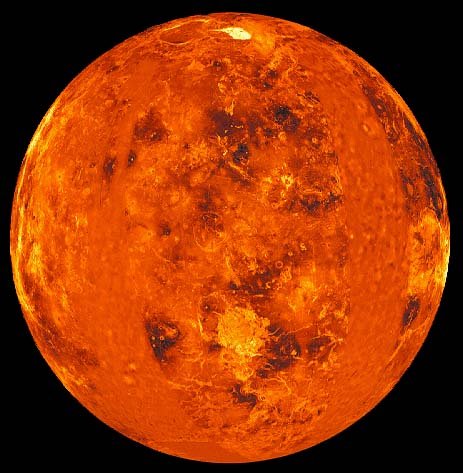 This global view of the surface of Venus is centered at 0 degrees east longitude. Magellan synthetic aperture radar mosaics from the first cycle of Magellan mapping are mapped onto a computer- simulated globe to create this image. Data gaps are filled with Pioneer-Venus Orbiter data, or a constant mid-range value. Simulated color is used to enhance small-scale structure. The simulated hues are based on color images recorded by the Soviet Venera 13 and 14 spacecraft. The image was produced by the Solar System Visualization project and the Magellan Science team at the JPL Multimission Image Processing Laboratory, and was released on October 29, 1991.