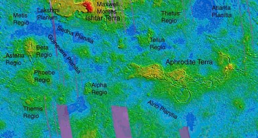This is a radar map of Venus based on data from Pioneer-Venus Orbiter data. The false colors indicate altitude with red being the highest altitude, yellow and green representing successively lower altitudes, and the blue represents lowland plains. Some of the prominent geographic features are labled. Two major highland areas Ishtar Terra and Aphrodite Terra are like continents, with the regions labled "Regia" being smaller highland areas. Much of the surface is in the "Planitia" or plains regions.