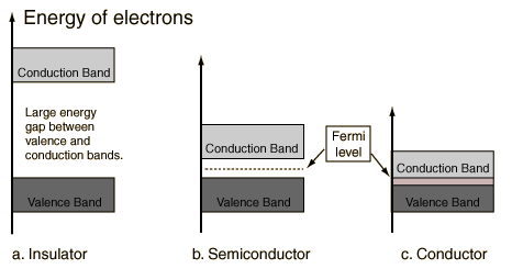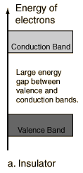 Most solid substances are insulators, and in terms of the band theory of solids this implies that there is a large forbidden gap between the energies of the valence electrons and the energy at which the electrons can move freely through the material (the conduction band).