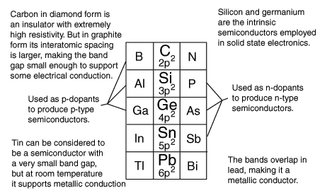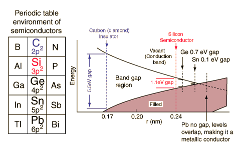 Interatomic spacing and semiconductorsThe energy bands for the outermost electrons are qualitatively similar for carbon, silicon, germanium and tin. The diagram shows that there is a strong correlation between the interatomic spacing and the electrical properties of the solid. ![]()
