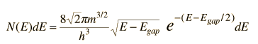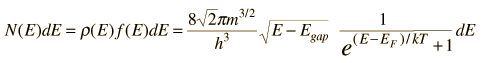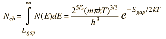 Conduction Electron Population for Semiconductor![]() The conduction electron population for a semiconductor is calculated by multiplying the density of conduction electron states r(E) times the Fermi function f(E). The number of conduction electrons as a function of energy is then given by ![]() This can be simplified by noting that for the energies of the conduction band, E-EF>>1, so the 1 in the denominator of the Fermi function becomes insignificant. I.e., the tail of the function which extends into the conduction band is so far out that it can be approximated by the Boltzmann function. Using the fact that The population density can then be written ![]() The total number of electrons in the conduction band, Ncb, can then be obtained by integrating the above function from the bottom of the conduction band upward. For all practical purposes, the upper limit of the integral can be taken to be infinity since by the time we reach the top of the conduction band, the integrand will be essentially zero.