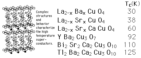 High Temperature SuperconductorsCeramic materials are expected to be insulators -- certainly not superconductors, but that is just what Georg Bednorz and Alex Muller found when they studied the conductivity of a lanthanum-barium-copper oxide ceramic in 1986. Its critical temperature of 30 K was the highest which had been measured to date, but their discovery started a surge of activity which discovered superconducting behavior as high as 125 K. ![]()