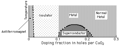 Cuprate Superconductor PhasesIllustrative of the complexity of the high-temperature superconductor materials is this phase diagram which applies to the cuprate materials. At very low doping, they show the long range order of an antiferromagnet. ![]() Doping breaks up the antiferromagnetic order and they become insulators. Only with doping fraction between about 0.1 and 0.2 do they become superconductors. |
