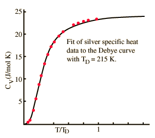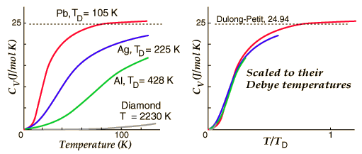 Since the Debye specific heat expression can be evaluated as a function of temperature and gives a theoretical curve which has a specific form as a funtion of T/TD, the specific heats of different substances should overlap if plotted as a function of this ratio. At left below, the specific heats of four substances are plotted as a function of temperature and they look very different. But if they are scaled to T/TD, they look very similar and are very close to the Debye theory. ![]()