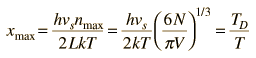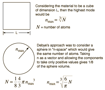 Debye Specific HeatBy associating a phonon energy ![]() with the vibrational modes of a solid, where vs is the speed of sound in the solid, Debye approached the subject of the specific heat of solids. Treating them with Einstein-Bose statistics, the total energy in the lattice vibrations is of the form ![]() This can be expressed in terms of the phonon modes by expressing the integral in terms of the mode number n. ![]() Here the factor 3p/2 comes from three considerations. First, there are 3 modes associated with each mode number n: one longitudinal mode and two transverse modes. Then you get a factor of 4p2 from integrating over the angular coordinates, treating the mode number n as the radius vector. Finally you constrain the integral to the quadrant in which all the components of n are positive, giving a factor of 1/8: the product of those is 3p/2. The usual form of the integral is obtained by making the substitution ![]() and the limit on the integral in terms of x is obtained from ![]() where the constant TD is here introduced. It is called the Debye temperature and is a constant associated with the highest allowed mode of vibration. When all the constants are put in, the integral takes the form ![]() The Debye specific heat expression is the derivative of this expression with respect to T. The integral cannot be evaluated in closed form, but numerical evaluation of the integral shows reasonably good agreement with the observed specific heats of solids for the full range of temperatures, approaching the Dulong-Petit Law at high temperatures and the characteristic T3 behavior at very low temperatures. The specific heat expression which arises from Debye theory can be obtained by taking the derivative of the energy expression above. ![]() This expression may be evaluated numerically for a given temperature by computer routines.