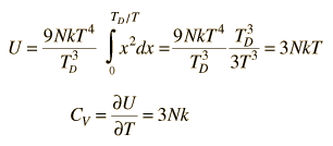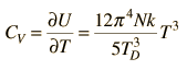 This T3 dependence of the specific heat at very low temperatures agrees with experiment for nonmetals. For metals the electron specific heat becomes significant at low temperatures and is combined with the above lattice specific heat in the Einstein-Debye specific heat.