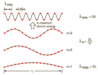 What is a Phonon?Considering the regular lattice of atoms in a uniform solid material, you would expect there to be energy associated with the vibrations of these atoms. But they are tied together with bonds, so they can't vibrate independently. The vibrations take the form of collective modes which propagate through the material. Such propagating lattice vibrations can be considered to be sound waves, and their propagation speed is the speed of sound in the material. The vibrational energies of molecules, e.g., a diatomic molecule, are quantized and treated as quantum harmonic oscillators. Quantum harmonic oscillators have equally spaced energy levels with separation DE = hu. So the oscillators can accept or lose energy only in discrete units of energy hu. The evidence on the behavior of vibrational energy in periodic solids is that the collective vibrational modes can accept energy only in discrete amounts, and these quanta of energy have been labeled "phonons". Like the photons of electromagnetic energy, they obey Bose-Einstein statistics. Considering a solid to be a periodic array of mass points, there are constraints on both the minimum and maximum wavelength associated with a vibrational mode. ![]()