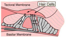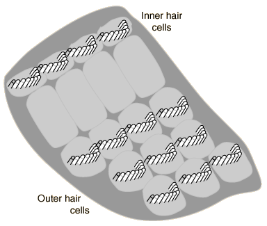 filled tympanic and vestibular canals. There are some 16,000 -20,000 of the hair cells distributed along the basilar membrane which follows the spiral of the cochlea.