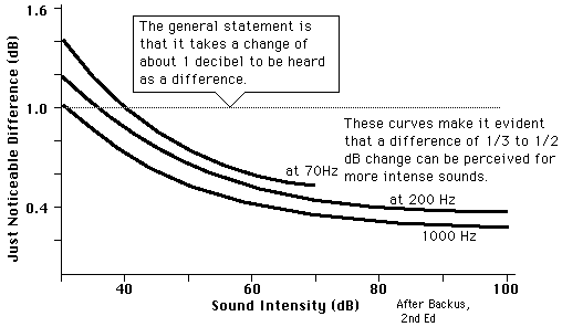 JND in Sound IntensityA useful general In fact, the use of the factor of 10 in the definition of the decibel is to create a unit which is about the least detectable change in sound intensity. That having been established, it can be noted that there are some variations. The jnd is about 1 dB for soft sounds around 30-40 dB at low and midrange freqencies. It may drop to 1/3 to 1/2 a decibel for loud sounds. Caution must be used in applying the "one decibel" criterion. It presumes that you are increasing the same sound by one decibel. If you were adding a sound outside the critical band of frequency from this sound, you would be exciting fresh nerve endings, and the one decibel rule can't be presumed to apply. This causes some concern about the perceptual encoding schemes used with modern digital recording which might eliminate some significant audible content by the use of a "one decibel" criterion for dropping content.