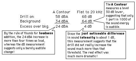 Analysis, Concrete Drill SoundSound measurement in decibels inside of buildings can be so misleading as to be worthless since it gives equal weighting to low frequency building sounds to which the human ear has minimal response. This example shows that the use of an A Contour filter gives a much better representation of what the ear hears. Besides the conceptual difference between sound loudness and sound intensity, this example employs the idea of the just noticeable difference in sound level. ![]()