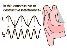Interference of SoundTwo traveling waves which exist in the same medium will interfere with each other. If their amplitudes add, the interference is said to be constructive interference, and destructive interference if they are "out of phase" and subtract. Patterns of destructive and constructive interference may lead to "dead spots" and "live spots" in auditorium acoustics. Interference of incident and reflected waves is essential to the production of resonant standing waves. Interference has far reaching consequences in sound because of the production of "beats" between two frequencies which interfere with each other.