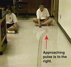 Phase Change in Slinky Wave![]() ![]() A wave reflected at a fixed end will undergo a 180 degree phase change upon reflection. This is instrumental in producing standing waves or resonance in vibrating strings. Experimenters are Kelly Jewett (right), Lisa White and Kim Wimpey.