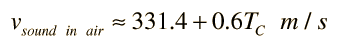 Speed of Sound in AirThe speed of sound in dry air is given approximately by ![]() where TC is the celsius temperature, This calculation is usually accurate enough, but for great precision one must examine the more general relationship for sound speed in gases. This sound speed does not apply to gases other than air, for example the helium from a balloon. It is important to note that the sound speed in air is determined by the air itself. It is not dependent upon the sound amplitude, frequency or wavelength.