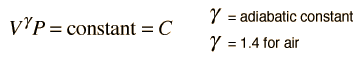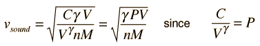 Sound Speed in an Ideal GasThe speed of sound for a uniform medium is determined by its elastic property (bulk modulus) and its density ![]() When a sound travels through an ideal gas, the rapid compressions and expansions associated with the longitudinal wave can reasonably be expected to be adiabatic and therefore the pressure and volume obey the relationship ![]() The adiabatic assumption for sound waves just means that the compressions associated with the sound wave happen so quickly that there is no opportunity for heat transfer in or out of the volume of air. The bulk modulus can therefore be reformulated by making use of the adiabatic condition in the form ![]() so that the derivative of pressure P with respect to volume V can be taken. ![]() Since the gas density is ![]() the speed of sound can be expressed as ![]() Using the ideal gas law PV = nRT leads to