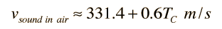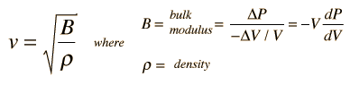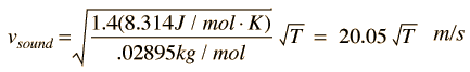 For air, the adiabatic constant γ = 1.4 and the average molecular mass for dry air is 28.95 gm/mol. This leads to ![]() Doing this calculation for air at 0°C gives vsound = 331.39 m/s and at 1°C gives vsound = 332.00 m/s. This leads to a commonly used approximate formula for the sound speed in air: ![]() For temperatures near room temperature, the speed of sound in air can be calculated from this convenient approximate relationship, but the more general relationship is needed for calculations in helium or other gases. The calculation above was done for dry air, and moisture content in the air would be expected to increase the speed of sound slightly because the molecular weight of water vapor is 18 compared to 28.95 for dry air. A revised average molecular weight could be calculated based on the vapor pressure of water in the air. However, the assumption of an adiabatic constant of γ = 1.4 used in the calculation is based upon the diatomic molecules N2 and O2 and does not apply to water molecules. So the detailed modeling of the effect of water vapor on the speed of sound would have to settle on an appropriate value of γ to use.