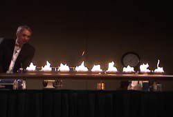 Physics professor Clint Sprott of the University of Wisconsin shows one way to visualize these longitudinal pressure waves in his "Wonders of Physics" demonstration show. A loudspeaker is driven by a tone generator to produce single frequency sounds in a pipe which is filled with natural gas (methane). A series of holes is drilled in the pipe to release a small amount of gas. Igniting the gas produces flames for which the height increases with the pressure in the pipe. The pattern of the flames shows the pressure variation and can be used to roughly measure the wavelength of the pressure wave in the pipe.