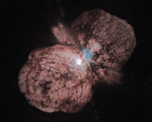 "This star was first cataloged by Edmond Halley in 1677, as a star of fourth magnitude. Since, its brightness has varied in a most remarkable way: In 1730, its brightness reached mag 2, and again fell to mag 4 in about 1782. It brightened again about 1801 and faded back to 4th magnitude in 1811. In 1820, Eta began to brighten steadily, reaching 2nd magnitude in 1822 and 1st mag in 1827. After this first preliminary maximum, the star faded back to mag 2 for about 5 years, then rose again to about mag 0. After a further slight decline, Eta's brightness increased once more and reached its maximal brilliance of nearly -1.0 in April 1843, when it outshone all stars in the sky but Sirius. After this brilliant show, the star slowly faded continuously, and became invisible in 1868. Interrupted by two minor outbursts around 1870 and 1889, Eta Carinae faded to about 8th magnitude around 1900, where it remained until 1941. At that time, the star began to brighten again, and reached 7th magnitude about 1953. Slowly and steadily, Eta Carinae became brighter until about 6th magnitude in the early 1990s - the star reached naked-eye visibility again at that time. Then in 1998-99, the star suddenly brightened by about a factor two."(SEDS) Eta Carinae is about 7500 light years from the Earth. NASA's Far Ultraviolet Spectroscopic Explorer detected a partner of Eta Carinae in 2005. The companion was detected by the eclipsing of Eta Carinae's X-rays with a period of 5.5 years. Sources