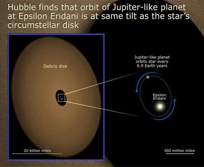 Epsilon EridaniThis star is located only about 10.5 light-years (ly) away in the northeastern part (03:32:55.84-09:27:29.74, ICRS 2000.0) of Constellation Eridanus, the River -- west of Rana (Delta Eridani) and northwest of Zaurak. Somewhat smaller and cooler than our own Sun, Sol, Epsilon Eridani is also less luminous. In Earth's night sky, however, it is clearly visible to the naked eye as the third closest star viewable without a telescope. On August 7, 2000, astronomers announced the discovery (a possible confirmation of earlier detections) of a Jupiter-like planet around this Sun-like star (press release -- details below). On October 9, 2006, a team of astronomers (led by G. Fritz Benedict and Barbara E. McArthur) working with the Hubble Space Telescope announced "definitive evidence" for the existence of a Jupiter-class planet around Epsilon Eridani using astrometic measurements (NASA press release -- more below). (Solstation) This main sequence, orange-red dwarf (K2 V) is a relative young star that may be only around 660 to 800 million years old, within the range between 500 million to a billion years old (Benedict et al, 2006; and Saffe et al, 2005). It may have about 83 (+/- 0.05) to 85 percent of Sol's mass (Benedict et al, 2006; and RECONS), 84 percent of its diameter (Johnson and Wright, 1983, page 653), but only about 27.8 percent of its luminosity (Saumon et al, 1996, page 17). The European Space Agency has used ultraviolet spectral flux distribution data to determine stellar effective temperatures and surface gravities, including those of Epsilon Eridani.(Solstation) The measured effective temperature for Epsilon Eridani was 5500K On October 9, 2006, a team of astronomers (led by G. Fritz Benedict and Barbara E. McArthur) working with the Hubble Space Telescope announced "definitive evidence" for the existence of a Jupiter-class planet around Epsilon Eridani using astrometic measurements combined with those made at the University of Pittsburgh's Allegheny Observatory (NASA press release). Coming astrometric with radial-velocity measurements to determine the tilt of the planet's orbit, the astronomers were able to estimate the "true mass" of planet b as about 1.55 +/- 0.24 times the mass of Jupiter. Located at an average distance (semi-major axis) of 3.39 +/- 0.36 AUs from Epsilon Eridani, the planet takes about 6.9 (6.85 +/- 0.03) years to complete its highly eccentric orbit (e= 0.702 +/- 0.039). Approaching as close as 2.4 and as far as 5.8 AUs from its host star, the planet's orbit is also tilted about 30.1 +/- 3.8 degrees from Earth's line of sight (Benedict et al, 2006). Although the planet's orbit takes it so far from Epsilon Eridani that oceans on any moons would freeze, life could potentially survive on a moon if it is massive enough to hold onto a dense heat-trapping atmosphere like Saturn's moon, Titan, according to astronomer G. Fritz Benedict. Astronomers hope to image the planet in 2007, when its orbit is closest to Epsilon Eridani and may reflect sufficient starlight for an image.(Solstation)