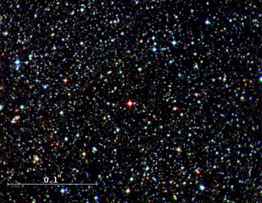 Proxima CentauriThis star is notable for being the closest star to the sun, but its brighter neighbor Alpha Centauri, a double star, is so nearly the same distance that data about it are usually given. It is about 4 light years distance, or about 3.8x1016 m from the sun. With its unique status as the closest star, Proxima Centauri, is an often quoted example of parallax distance measurement. The apparent ellipse in which Proxima Centauri moves during the year as a result of the Earth's orbit around the sun is about the size of a dime observed at three miles distance. Its parallax is 0.762 arcsec, corresponding to a distance of 1.31 parsecs. ![]() The red star in the center is proxima centauri. Most of the other visible stars are hundreds of times more distant. This star is also remarkable because it exhibits the largest proper motion, moving against the background of more distant stars by 10.3 arcseconds per year. Its distance is 1.8 parsecs = 5.9 light years. |