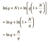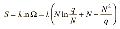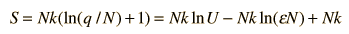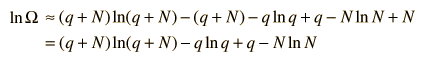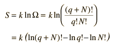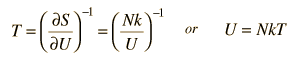 The entropy of the Einstein solid can be expressed in terms of the multiplicity. To make the multplicity expression manageable, consider the following steps: ![]() The numbers q and N are presumed large and the 1 is dropped. Now making use of Stirling's approximation to evaluate the factorials ![]() Now making the physical assumption that the number of energy units is much larger than the number of oscillatore, q>>N, the expression can be further simplified. With rearrangement ![]() Besides making use of log combination rules, the above steps make use of the series expansion of ln(1+N/q) which can be approximated by the first term when q>>N: (approximately, ln(1+x)=x if x<<1). Substitution gives an expression for the entropy of the Einstein solid: ![]() Finally we can make a connection to something akin to a real-world solid. The internal energy U can be represented by q times the oscillator energy unit hf= e. The last term above will be negligible under the assumption q>>N, so the entropy expression becomes ![]() Using the definition of temperature as a function of entropy gives ![]() This is what is expected from equipartition of energy. Each oscillator has two degrees of freedom, and each should represent kT/2 of energy, giving U=NkT. |
