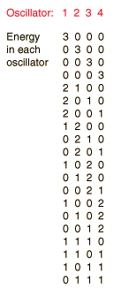 ![]() The conceptual Einstein solid is useful for examining the idea of multiplicity in the distribution of energy among the available energy states of the system. All of the energy levels are considered to be equally probable within the constraint of having q units of energy and N oscillators. As an example, consider q=3 units of energy distributed in an Einstein solid with N=4 oscillators.