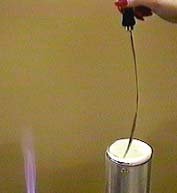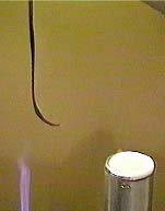 Note that the strip bends more when placed over the burner than when placed in the liquid nitrogen. This implies that the temperature of the flame is further above room temperature than the liquid nitrogen is below it, if the expansion coefficient is the same. Note the frost which forms on the bimetallic strip when it is first placed above the flame. |