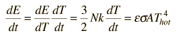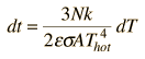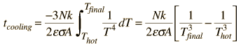 Radiative Cooling TimeThe rate of radiative energy emission from a hot surface is given by the Stefan-Boltzmann law . ![]() Here P is the power emitted from the area, and E is the energy contained by the object. For very hot objects, the role of the ambient temperature can be neglected. If the hot temperature is more than 3.16 times the ambient, then the contribution of ambient terms is less than 1%. For example, for 300K ambient on the earth, an object of temperature higher than 1000K can be treated like a pure radiator into space. If the heat loss is purely radiative and not limited by heat transfer to the radiating surface, then the cooling time can be modeled for a hot object. If the energy of the object can be characterized by pure translational kinetic energy according to equipartition of energy, then ![]() Using the chain rule for differentiation ![]() Rearranging gives us ![]() and integrating gives the cooling time ![]() It must be kept in mind that for macroscopic objects, the calculated cooling time for the object as a whole will always be shorter than the real cooling time, so that it gives a lower bound. The above relationship assumes infinite thermal conductivity so that the temperature of the whole object is equal to the surface temperature. In the real world, the surface will cool faster than the interior. The rate of heat transfer from the interior will be expected to limit the rate of radiative loss from the surface.