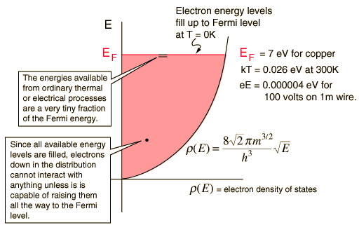 Electron Contribution to Specific HeatOne of the great mysteries in physics in the early part of the 20th century was why electrons didn't appear to contribute to specific heat. How could they contribute to electrical conduction and heat conduction and not to specific heat? ![]() The small fraction of electrons which are within kT of the Fermi level does contribute a small specific heat, and this electron specific heat becomes significant at very low temperatures. |