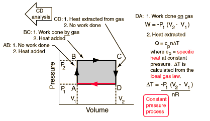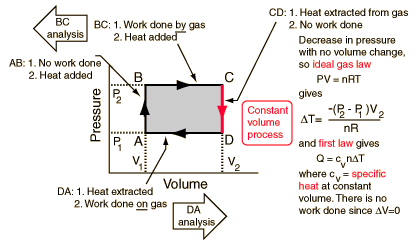 Engine CyclesFor a constant mass of gas, the operation of a heat engine is a repeating cycle and its PV diagram will be a closed figure. The idea of an engine cycle is illustrated below for one of the simplest kinds of cycles. If the cycle is operated clockwise on the diagram, the engine uses heat to do net work. If operated counterclockwise, it uses work to transport heat and is therefore acting as a refrigerator or a heat pump. ![]()