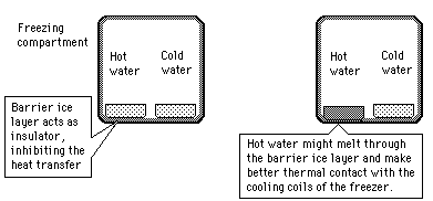 Hot Water Freezing?The rumor persists that hot water will freeze faster than cold water. It sounds implausible because the hot water has more internal energy which must be removed before it can start the phase change. Perhaps this tale had its origin in the days of non-frost-free refrigerators in which a considerable buildup of ice on the walls of the freezing compartment was a common occurrence. Ice acts as an insulator, inhibiting the cooling process. ![]()