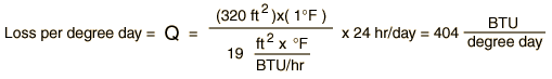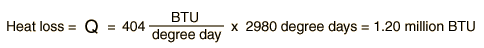 The range of loss rates biven by DOE for uninsulated typical dwellings is 15,000 to 30,000 BTU/degree-day. Choosing 25,000 BTU/degree-day:
