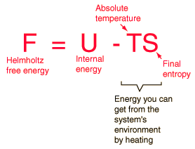 The internal energy U might be thought of as the energy required to create a system in the absence of changes in temperature or volume. But as discussed in defining enthalpy, an additional amount of work PV must be done if the system is created from a very small volume in order to "create room" for the system. As discussed in defining the Helmholtz free energy, an environment at constant temperature T will contribute an amount TS to the system, reducing the overall investment necessary for creating the system. This net energy contribution for a system created in environment temperature T from a negligible initial volume is the Gibbs free energy.