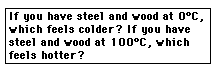 Steel and Wood at 0 CYour sense of touch is not a reliable thermometer because the sense of "hotness" or "coldness" of a surface depend upon other factors as well as the temperature. Most notably, the thermal conductivity of the object touched plays a part in how hot or cold it feels. With both objects at 0¡C, steel feels colder than wood because its thermal conductivity is much higher and it conducts energy away from your finger faster. If both objects are at 100¡C, much higher than body temperature, the steel will feel hotter than the wood because it will conduct energy to your finger much more rapidly. |