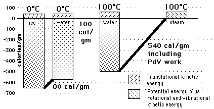 Water and Ice at 0 CThe constancy of temperature when water is going through its phase changes at 0 C and 100 C provides some insight into the nature of the internal energy of water, ice, and steam and into the nature of temperature. The fact that large amounts of energy are added to accomplish melting or vaporization without a change in temperature shows that temperature does not measure all of the internal energy of the water - in fact it is only a measure of the translational kinetic energy of the water molecules. The large size of the phase change energy indicates that there is a large amount of potential energy associated with the intermolecular forces between the water molecules. During the melting and vaporization phase changes, the energy goes into the breaking down of the solid or liquid bonds, reducing the binding potential energy by the amount of the phase change energy and therefore not changing the average translational kinetic energy as reflected by the temperature. |
