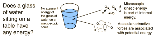 Internal EnergyInternal energy is defined as the energy associated with the random, disordered motion of molecules. It is separated in scale from the macroscopic ordered energy associated with moving objects; it refers to the invisible microscopic energy on the atomic and molecular scale. For example, a room temperature glass of water sitting on a table has no apparent energy, either potential or kinetic . But on the microscopic scale it is a seething mass of high speed molecules traveling at hundreds of meters per second. If the water were tossed across the room, this microscopic energy would not necessarily be changed when we superimpose an ordered large scale motion on the water as a whole. ![]() Related energy quantities which are particularly useful in chemical thermodynamics are enthalpy, Helmholtz free energy, and Gibbs free energy.