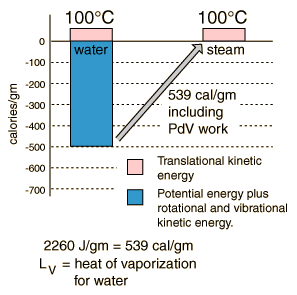 | The energy required to change a gram of a liquid into the gaseous state at the boiling point is called the "heat of vaporization". This energy breaks down the intermolecular attractive forces, and also must provide the energy necessary to expand the gas (the PDV work). For an ideal gas , there is no longer any potential energy associated with intermolecular forces. So the internal energy is entirely in the molecular kinetic energy.