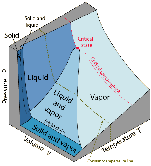 PvT Surface for a Substance which Expands Upon Freezing![]() The equilibrium states of a simple, compressible substance can be specified in terms of its pressure, volume and temperature. If any two of these state variables is specified, the third is determined. This implies that the states of the substance can be represented as a surface in a three dimensional PvT space. The PvT surface above represents a substance which expands upon freezing. The vast majority of substances contract upon freezing. The notable exception is water for which the expansion upon freezing has an enormous impact on the nature of the Earth. A considerable amount of information about the phases of matter can be illustrated with the PvT surface. The solid, liquid and gas(vapor) phases can be represented by regions on the surface. Note that there are regions on the surface which represent a single phase, and regions which are combinations of two phases. A point lying on a line between a single-phase and a two-phase region represents a "saturation state". The line between the liquid and the liquid-vapor regions is called the liquid-saturation line and any point on that line represents a saturated-liquid state. A point on the boundary between the vapor and the liquid-vapor regions is called a saturated-vapor state. Note the critical state where the saturated-liquid and saturated-vapor lines meet. The state variables of this unique point are denoted by Pc, vc and Tc. If a substance is above the critical temperature Tc, it cannot condense into a liquid, no matter how high the pressure. This merging of the liquid and vapor states above the critical temperature is a characteristic of all known substances. While a pure vapor state can exist at a pressure lower than Pc, at pressures above Pc it is constrained to be a vapor. States with pressures above Pc are described as "supercritical states". The remarkable "triple state" of matter where solid, liquid and vapor are in equilibrium may be characterized by a temperature called the triple point. The triple state is represented by a line parallel to the Pv plane with a characteristic pressure for the substance but variable volume. The triple point temperature of water is assigned the value 273.16 K and the triple state of water is used as the