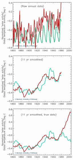![]() This illustration is a sketch of data from Durkin, based on data published by Friis-Christensen and Lassen. The end of the solar data has been altered in response to corrections of their data. This correlation between solar activity and temperature has been critiqued by Schneider and others, so it is an active area of investigation. The measured solar activity is well-correlated with the observed temperature variations, but does not follow the recent upturn in temperature as the originally published plot indicated. While it appears that the measured solar cycle length tracks the temperature better than the CO2 concentration for the twentieth century up to 1970, this presented data remains quite controversial. When you look at the climate models that seek to show the human influence past 1970, you do see a good correlation of the temperature with the projected CO2 influence included, while the correlation with solar cycle length weakens.