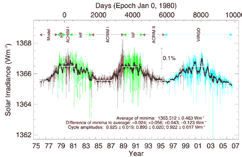 Correlation of global temperature with solar activityThe solar output is very nearly constant, as shown in the plot below. The range of variation is about 0.2%, so reproducible that it is often referred to as the "solar constant". ![]() But there are other aspects of the Sun's activity that are not constant, as indicated by the changing sunspot activity.