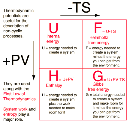 Four quantities called "thermodynamic potentials" are useful in the chemical thermodynamics of reactions and non-cyclic processes. They are internal energy, the enthalpy, the Helmholtz free energy and the Gibbs free energy.