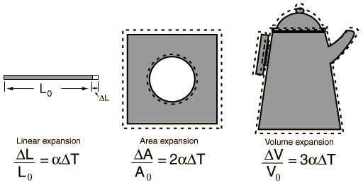 Thermal ExpansionOver small temperature ranges, the linear nature of thermal expansion leads to expansion relationships for length, area, and volume in terms of the linear expansion coefficient . ![]()