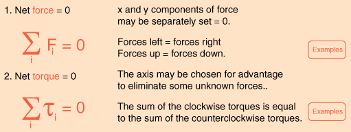 Conditions for EquilibriumAn object at equilibrium has no net influences to cause it to move, either in translation (linear motion) or rotation. The basic conditions for equilibrium are: