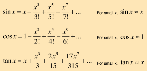 Applications of Trig SeriesOne of the most important applications of trigonometric series is for situations involving very small angles. For such angles, the trigonmetric functions can be approximated by the first term in their series. This gives the useful small angle approximations: ![]() Examples of the use of the small angle approximation are in the calculation of the period of a simple pendulum, and the calculation of the intensity minima in single slit diffraction. This approximation is used in most of the common expressions of geometrical optics which are built on the concept of surface power for lenses. This approximation sin x = x reaches a 1% error at about 14 degrees. |