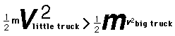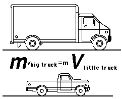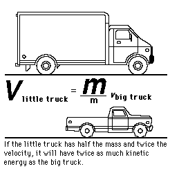 If the big truck and the smaller truck have equal momentum, as stated in the equal momentum example, then the smaller truck will have to have a higher velocity. Since kinetic energy depends upon the square of the velocity, this implies that the smaller truck will have a higher kinetic energy. By the work-energy principle, then, it will take more work to stop the smaller truck.