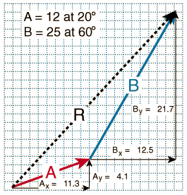 The process can be done mathematically by finding the components of A and B, combining to form the components of R, and then converting to polar form.