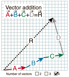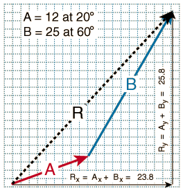 Adding two vectors A and B graphically can be visualized like two successive walks, with the vector sum being the vector distance from the beginning to the end point. Representing the vectors by arrows drawn to scale, the beginning of vector B is placed at the end of vector A. The vector sum R can be drawn as the vector from the beginning to the end point.