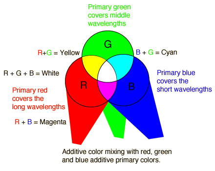 Additive color mixing is the kind of mixing you get if you overlap spotlights in a dark room, as illustrated at left. The commonly used additive primary colors are red, green and blue, and if you overlap all three in effectively equal mixture, you get white light as shown at the center. Additive color mixing is conceptually simpler than the subtractive color mixing you get with paints and pigments since you are just adding light energy in different ranges of the visible spectrum.
