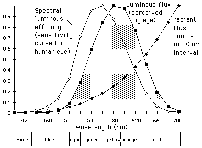 If the human eye responded equally to all wavelengths in the visible range, the candle flame would appear red. But since the eye sensitivity peaks in the green and diminishes toward the red wavelengths, the eye perceives the color as yellow.