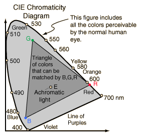 Any attempt to depict the gamut of human color vision on a computer monitor must be accompanied by numerous qualifications and exceptions. In the first place, you cannot display the range of human color perception on an RGB monitor - the gamut of normal human vision covers the entire CIE diagram while the gamut of an RGB monitor can be displayed as a triangular region within the CIE diagram. Another qualification is that the hue and saturation associated with a given color name can vary over a considerable range. Add to that the variations with different kinds of display monitors, and you rightly conclude that an accurate rendition is impossible. With all those excuses, however, it still might be instructive to provide a rough idea of the regions of the CIE Diagram associated with common color names.